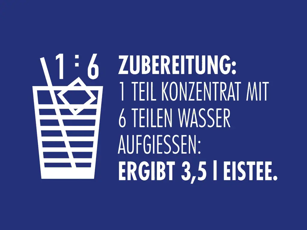Einfach das Eistee Konzentrat im Verhältnis 1:6 mit Wasser mischen, gut kühlen und genießen. Je nach Geschmack kann die Intensität individuell angepasst werden.